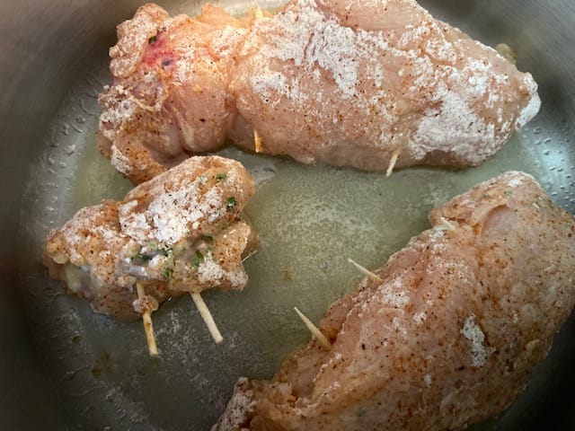- Coat the chicken and shake off the excess. In a frying pan melt butter, and add the chicken.