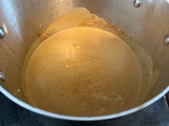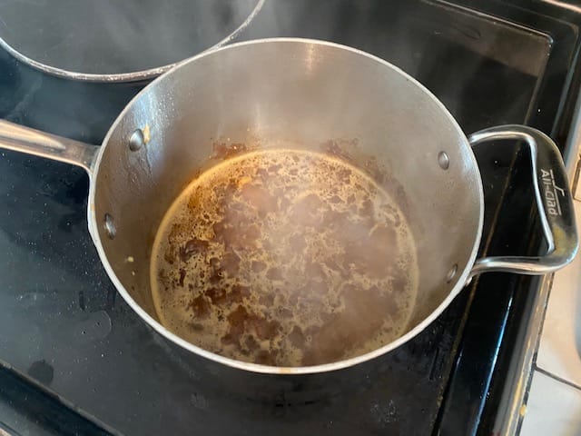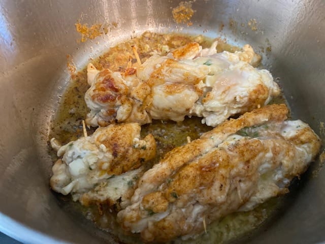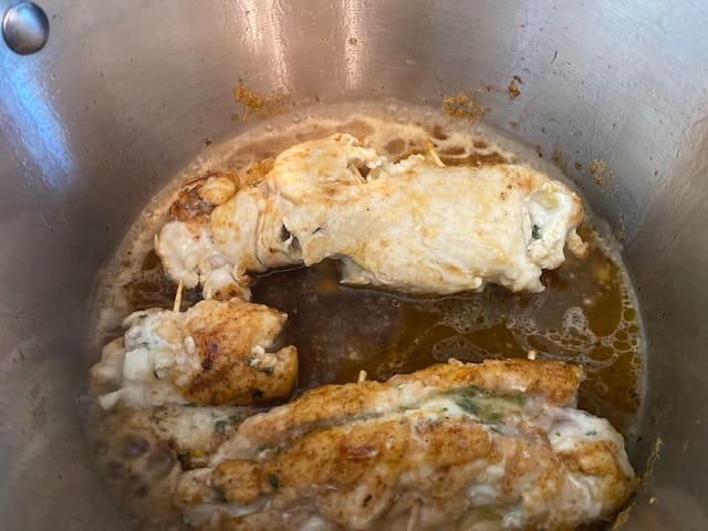 - Deglaze the frying pan with chicken broth and wine, really scraping the bottom bits.