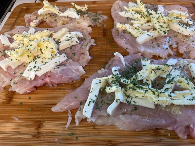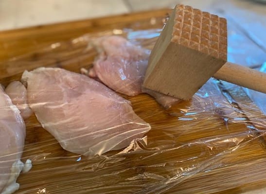 Flatten chicken breast to do this I covered the chicken with saranwrap so that the raw chicken juice’s don’t go flying.