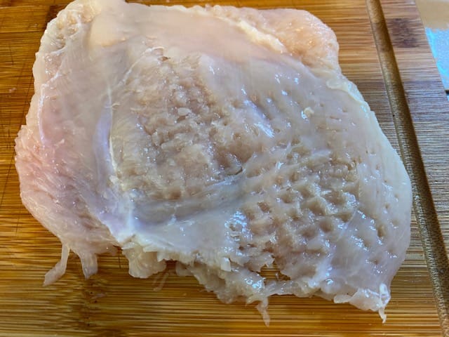 - Flatten chicken breast until about 3/8 of an inch thick.